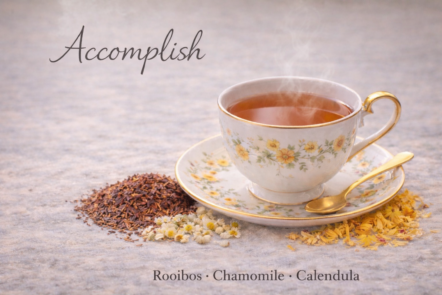 Accomplish is a naturally caffeine-free herbal tea created to support steady focus, completion, and a sense of quiet satisfaction.