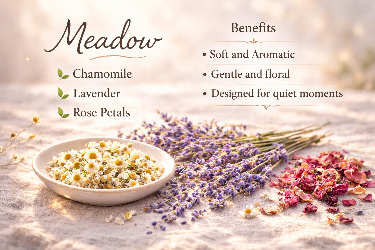 The Meadow blend, with chamomile, lavender, and rose petals, was created as a gentle companion for evenings and reflective moments when you want your day to close more softly and with intention.